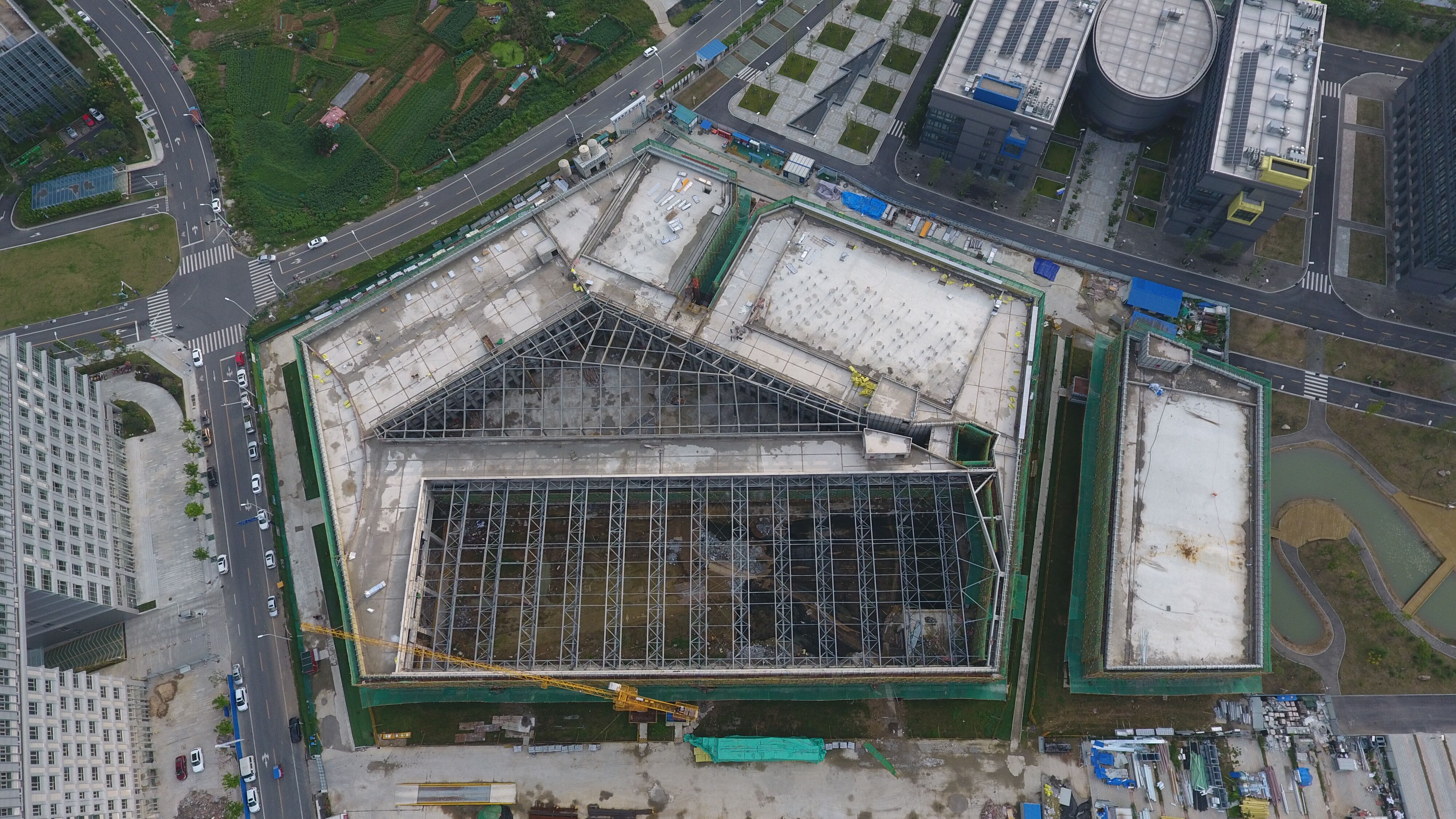 該工程總建筑面積約29472.95m2,鋼筋混凝土框架結(jié)構(gòu),鋼結(jié)構(gòu)布置在綜合實(shí)驗(yàn)大樓A區(qū)、B區(qū)、F區(qū)屋頂和中庭G區(qū)采光頂區(qū)域及力學(xué)實(shí)驗(yàn)室屋頂。其中綜合實(shí)驗(yàn)大樓A區(qū)、B區(qū)屋頂鋼結(jié)構(gòu)、力學(xué)實(shí)驗(yàn)室屋頂鋼結(jié)構(gòu),布置在標(biāo)高為15米處,由“亞”型箱梁、H型鋼梁組成的鋼屋蓋結(jié)構(gòu),上鋪壓型鋼板非組合屋面板,其中單榀“亞”型鋼梁最大跨度31.2米,重45噸,采用300t履帶吊跨外安裝;綜合實(shí)驗(yàn)大樓F區(qū)屋頂鋼結(jié)構(gòu),布置在標(biāo)高為15米處,由倒三角管桁架、支撐體系組成的鋼屋蓋結(jié)構(gòu),上鋪鋼骨架輕型板,其中單榀管桁架跨度36.8米,重19噸,采用500t汽車吊跨外安裝;綜合實(shí)驗(yàn)大樓中庭G區(qū)采光頂鋼結(jié)構(gòu),由“鋼柱+異形鋼梁”構(gòu)筑成空間異形結(jié)構(gòu),異形結(jié)構(gòu)由六個(gè)“折扇型”曲面構(gòu)成,梁頂標(biāo)高21.9米,屋面為玻璃采光頂,其中鋼梁最大跨度44.6米,施工技術(shù)難度大。