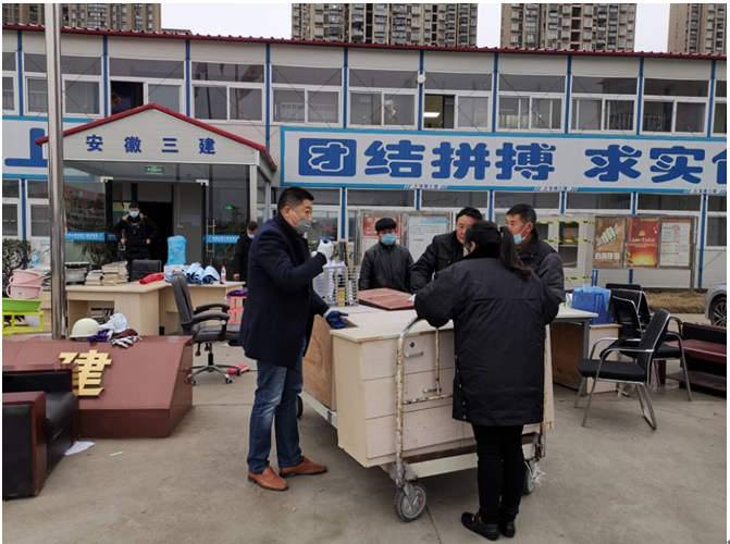 正值大年初一午飯時間,八公司領(lǐng)導立即在分公司工作群及老年護理院項目工作群發(fā)出通知組織搬遷人員。不到1個小時,一支十五名管理人員組成的搬遷突擊隊趕到項目部集結(jié)完畢,項目經(jīng)理高瑞凱擔任隊長。李家保在現(xiàn)場要求管理人員首先要做好個人防護措施,全部佩戴口罩,同時要求項目要做好溝通工作,把必要的生活設(shè)施及部分辦公設(shè)施留給醫(yī)護人員使用,堅決支持市二院做好疫情防治工作。突擊隊成員頂著雨雪,冒著嚴寒,將資料、物品裝箱、編號,重要資料指定專人負責搬運并跟蹤碼放地點。經(jīng)過三天的緊張整理和搬遷,1月28日晚順利完成兩棟兩層活動房辦公物資、臨時庫房等物資搬遷,并在市二院指定新辦公地點整理完畢,辦公區(qū)順利移交。