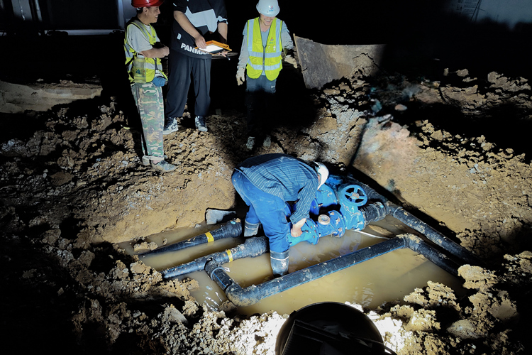 一天晚上,正值項(xiàng)目室外給水及消防新老管網(wǎng)接駁,為了確保工程萬(wàn)無(wú)一失,建工三建優(yōu)秀共產(chǎn)黨員、安裝項(xiàng)目經(jīng)理曾小均同志充分發(fā)揮黨員先鋒模范帶頭作用,與施工員高峰同志一起下到泥濘不堪的水坑中安裝閥門(mén)。由于夜間作業(yè)面的能見(jiàn)度受到限制,于是,技術(shù)員孫維康同志便舉著燈,同技術(shù)負(fù)責(zé)楊濤同志一起摸排接駁的管道是否存在漏水點(diǎn)。雖然工作很辛苦,但是看到大家都在為了達(dá)成同一個(gè)目標(biāo)而共同拼搏的場(chǎng)景,每一個(gè)安裝管理人員又都充滿(mǎn)干勁,就像曾小均說(shuō)的那樣:“這是安裝人應(yīng)有的使命與擔(dān)當(dāng)!是建工三建一脈相承的鐵軍精神和不辱使命鐵肩擔(dān)當(dāng)?!?/span>