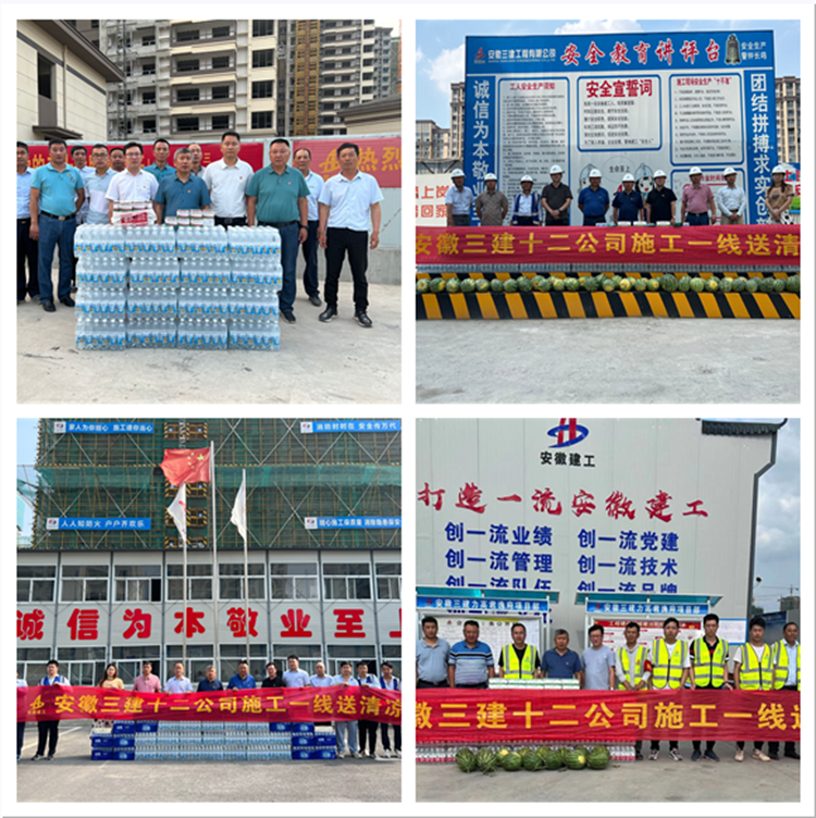 炎炎夏日送清涼,點(diǎn)滴關(guān)懷暖人心。為做好防暑降溫工作,確保項(xiàng)目一線職工安全度夏。6月20日至6月22日,十二公司先后到滁州高速項(xiàng)目、蒙城高速項(xiàng)目、渦陽(yáng)高速項(xiàng)目和六安力高項(xiàng)目開展“送清涼”慰問(wèn)活動(dòng),帶來(lái)了防暑降溫的西瓜、礦泉水、十滴水等清涼食品和防暑藥品,為奮戰(zhàn)在一線的工人兄弟送上一絲清涼。