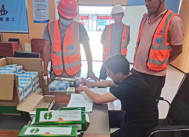 驕陽(yáng)似火,熱浪襲人。為認(rèn)真做好高溫天氣勞動(dòng)保護(hù)工作,切實(shí)維護(hù)參建工人的職業(yè)安全與健康權(quán)益,深入落實(shí)安全生產(chǎn)月活動(dòng),近日,七公司組織在肥地區(qū)項(xiàng)目開(kāi)展“送清涼”活動(dòng)。本次活動(dòng)涉及合肥一中東校區(qū)和御景黃城兩個(gè)項(xiàng)目、近30個(gè)班組,約1400名民工。發(fā)放的防暑降溫物品包括人丹、十滴水、清涼油及藿香正氣口服液等,合肥一中東校區(qū)項(xiàng)目每天還為班組工人發(fā)放兩次雪糕冷飲。在發(fā)放現(xiàn)場(chǎng),項(xiàng)目管理人員詳細(xì)告知工人藥品使用方法與功效,并細(xì)心叮囑工人夏季要注意防暑降溫,防止中暑。